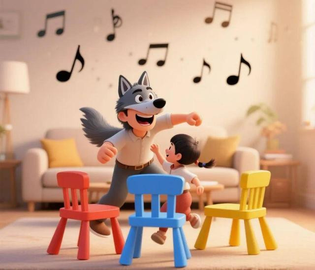 游戏介绍:这是可以全家人一起玩的游戏。大人和小孩围绕椅子转圈,一首音乐结束后开始抢椅子,爸爸扮演大灰狼的角色,没有抢到椅子的人会被“吃掉”。