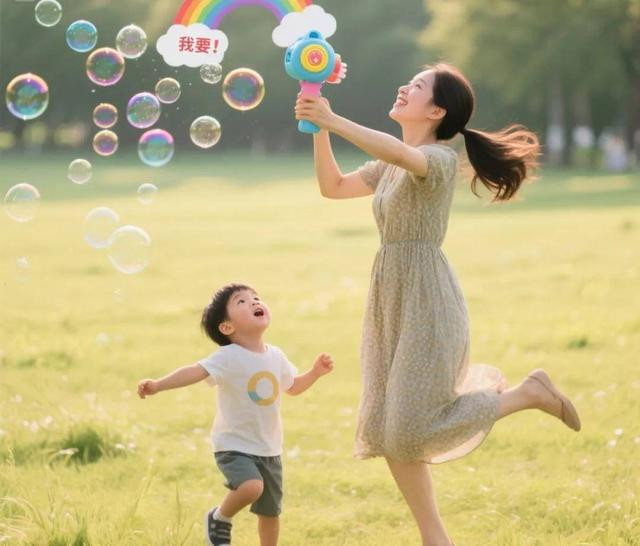 游戏介绍:买来一个泡泡机,打开泡泡机的那一刻,我们也要像孩子一样开心地跳起来,吸引孩子主动观察、模仿,学习操作物品的经验。中途可以暂停,引导孩子主动表达想要吹泡泡,加强互动和沟通。